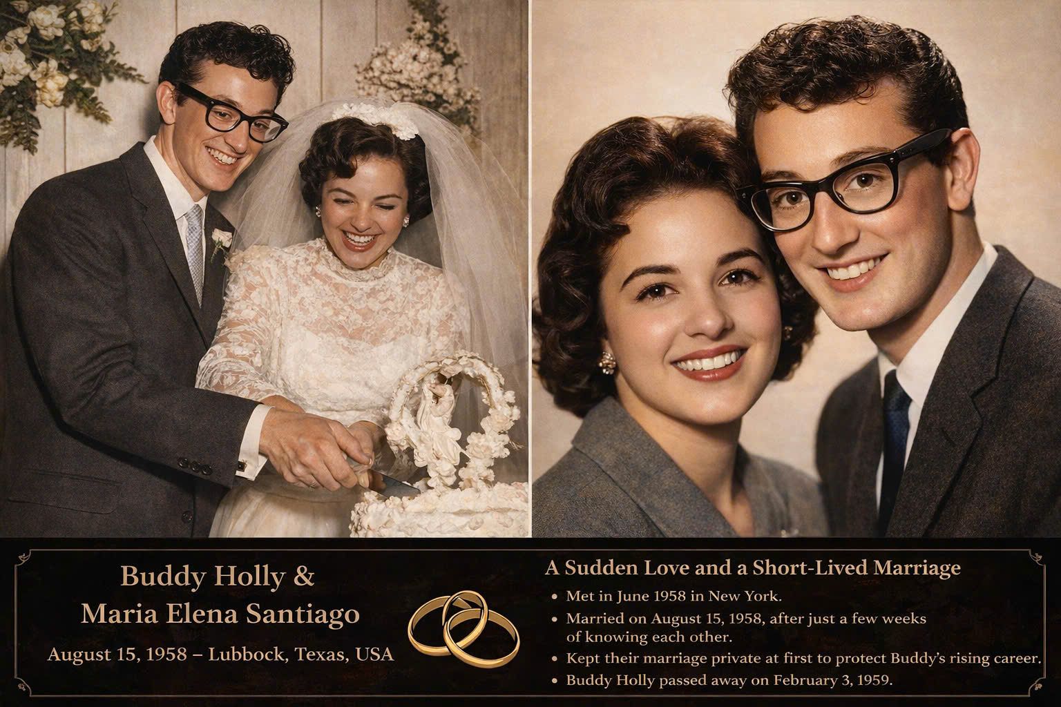 The marriage of Buddy Holly stands as one of the most touching and bittersweet love stories in the history of rock and roll. Though brief, his relationship with Maria Elena Holly was filled with deep affection, spontaneity, and a sense of destiny that continues to move fans decades later.